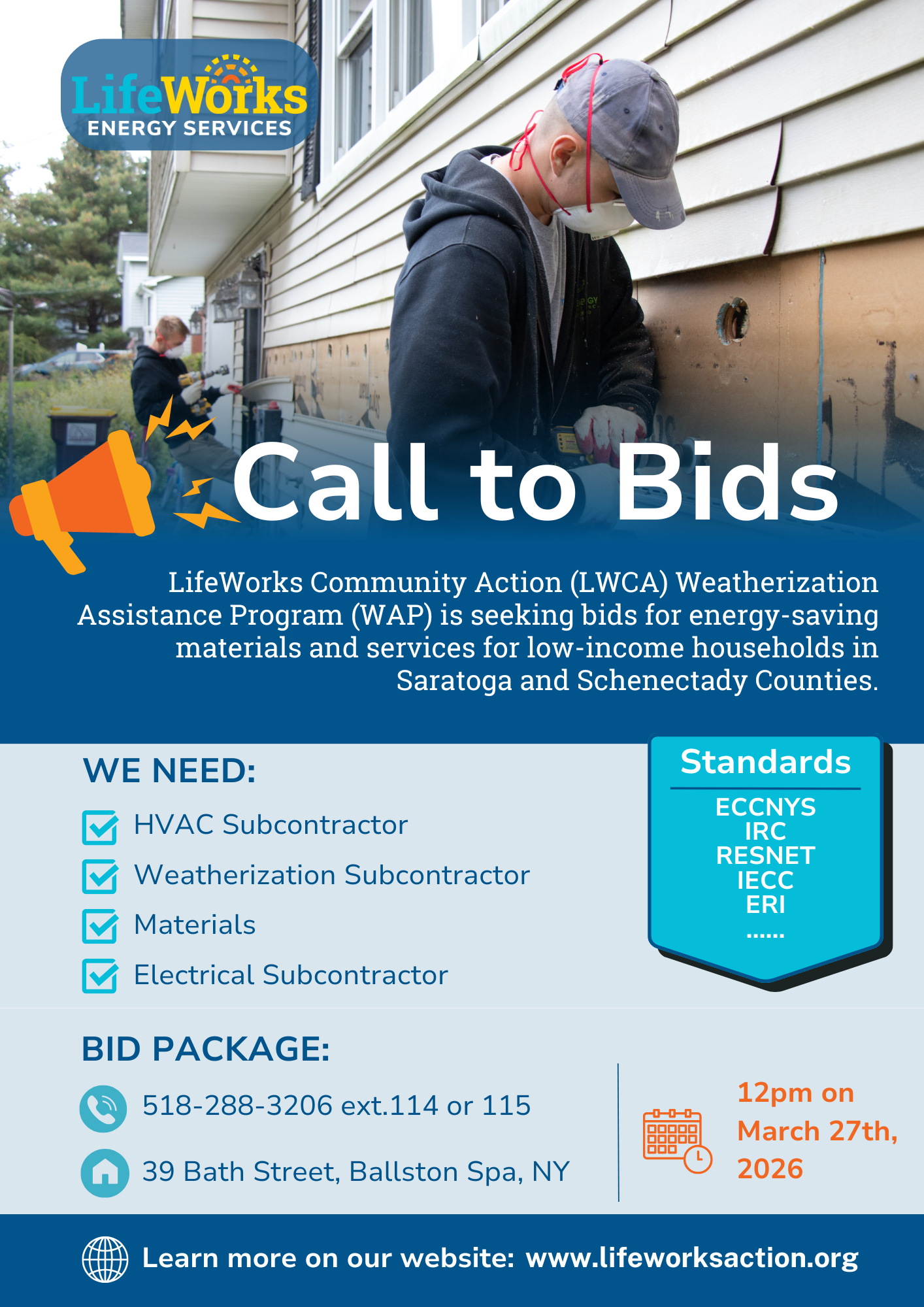 To obtain a Bid Package for Materials, HVAC Subcontractors, Electrical Subcontractors or Weatherization Subcontractors. Please contact LifeWorks Community Action, Weatherization Department at 518-288-3206 ext. 114 or 115. Or pick up package at LifeWorks Community Action, 39 Bath Street, Ballston Spa, NY.